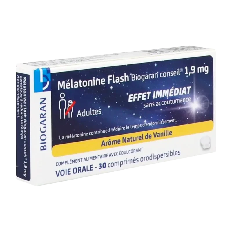 - Mélatonine seule (Biogaran Mélatonine 1mg) : régule le rythme veille/sommeil.