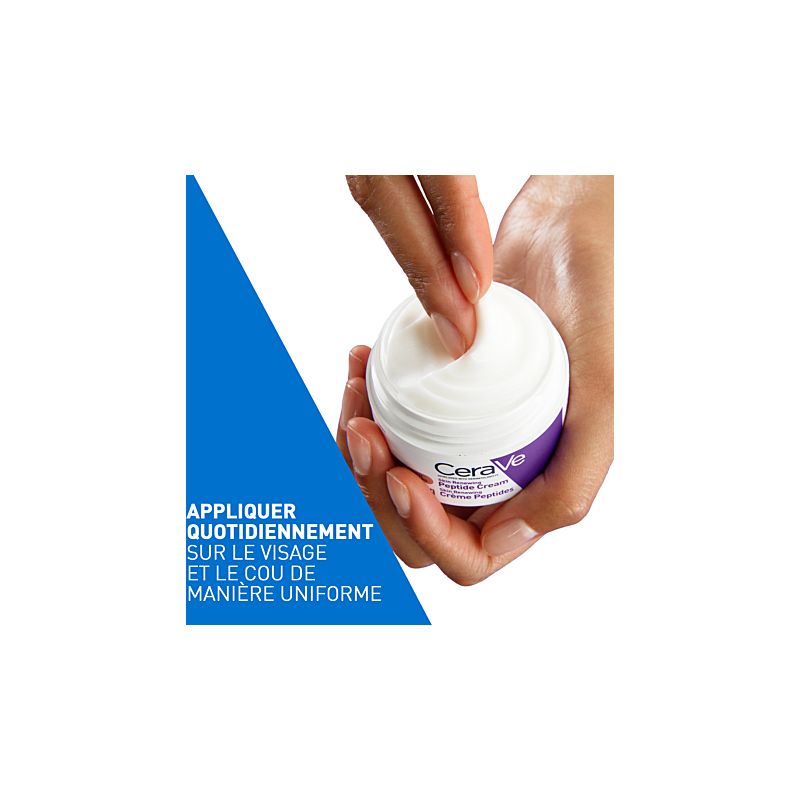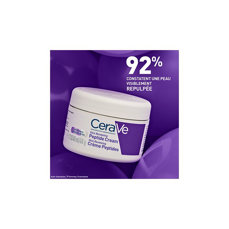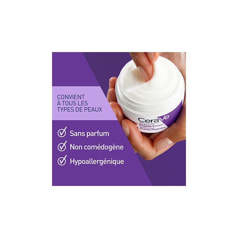La CeraVe Skin Renewing Crème Peptides réduit visiblement les rides et ridules, restaure la barrière cutanée grâce aux céramides, hydrate intensément avec la technologie MVE et améliore la fermeté pour une peau plus lisse et rebondie.