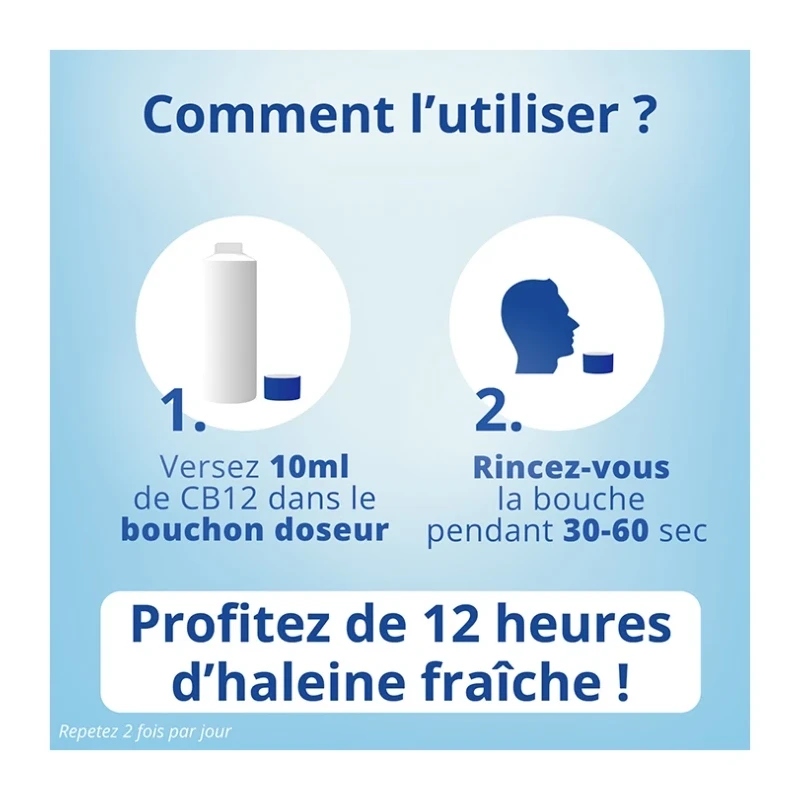 Pour combattre la mauvaise haleine, adoptez une hygiène buccale rigoureuse avec brossage, fil dentaire et bain de bouche CB12. Ce dernier neutralise les composés sulfurés volatils à l'origine de la mauvaise haleine pour une haleine fraîche pendant 12 heures. L'action prolongée aide à maintenir une bouche saine.