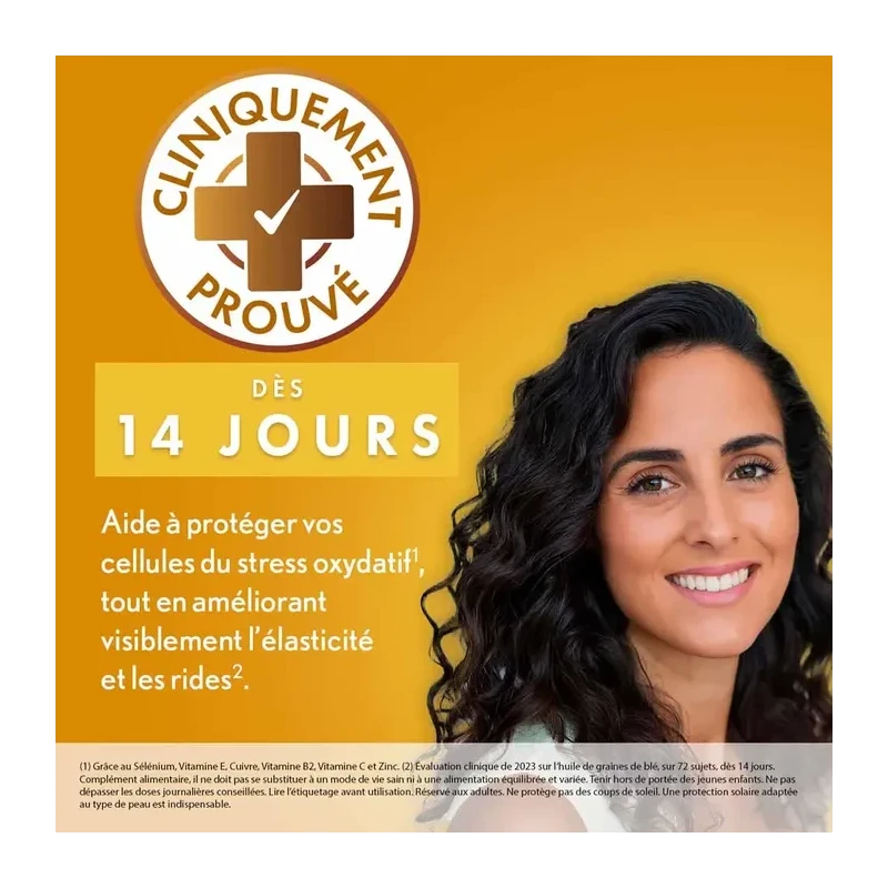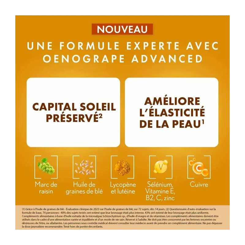 Ce complément alimentaire ne remplace pas une protection solaire adaptée et ne protège pas des coups de soleil. Il est impératif d'utiliser une crème solaire appropriée à votre type de peau lors de chaque exposition.