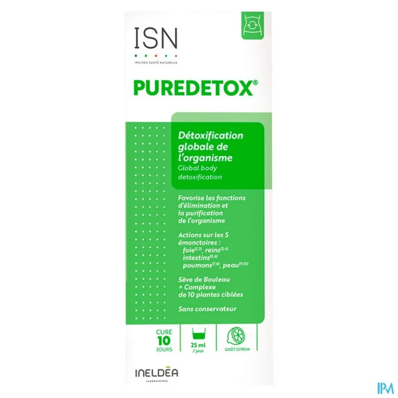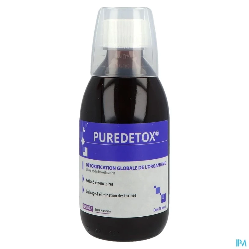 Puredetox détoxification globale est une solution buvable développée par Ineldea qui combine des extraits de plantes et des fibres prébiotiques pour favoriser l'élimination des toxines par les 5 émonctoires principaux de l'organisme de manière naturelle et efficace.