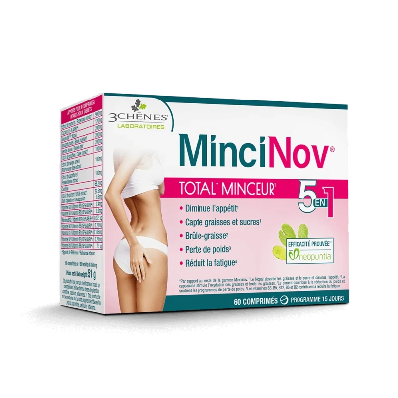 Mincinov agit grâce au nopal qui capte les graisses alimentaires et réduit l'appétit, tandis que la vitamine C stimule le métabolisme énergétique. Cette action combinée favorise la perte de poids progressive dans le cadre d'une hygiène de vie équilibrée.