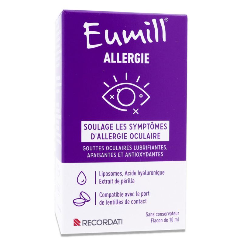 Eumill gouttes oculaires est indiqué pour soulager les yeux rouges et irrités causés par des réactions allergiques saisonnières ou environnementales. Ce produit convient particulièrement en cas de rougeur oculaire accompagnée de démangeaisons, larmoiements ou sensations de brûlure liées au contact avec les pollens.