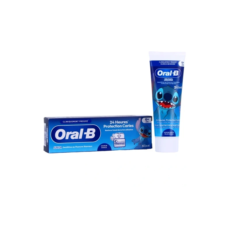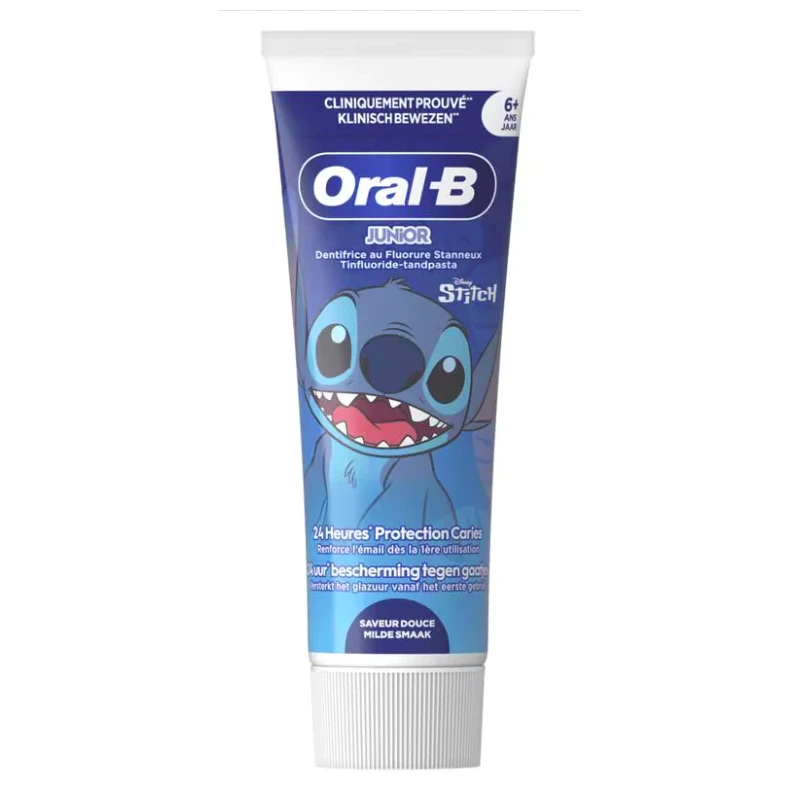 Le dentifrice Oral-B Junior Protection Caries Stitch est idéal pour les enfants à partir de 6 ans. Sa formule enrichie en fluor offre une protection anticaries adaptée tout en proposant une saveur douce appréciée des jeunes utilisateurs pour un brossage agréable quotidien.