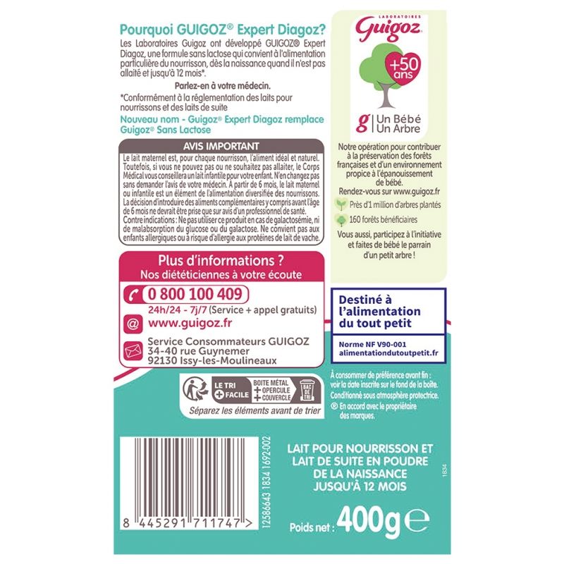 Guigoz Expert Diagoz est la formule spécialement conçue pour les bébés sans lactose. Cette préparation infantile remplace le lactose par du sirop de glucose tout en apportant tous les nutriments essentiels à la croissance de votre nourrisson dès la naissance.