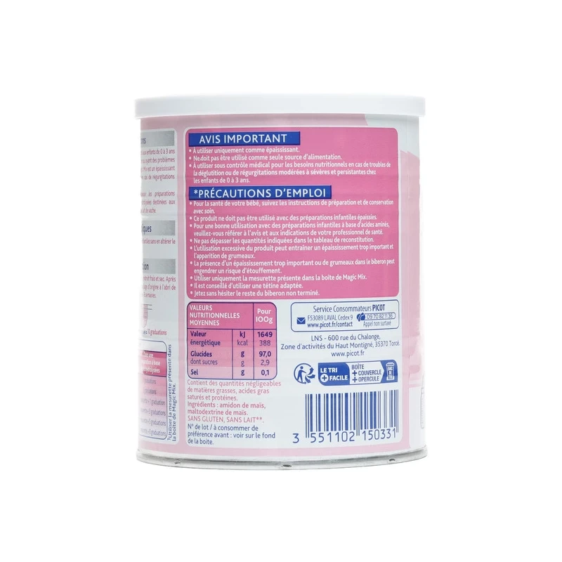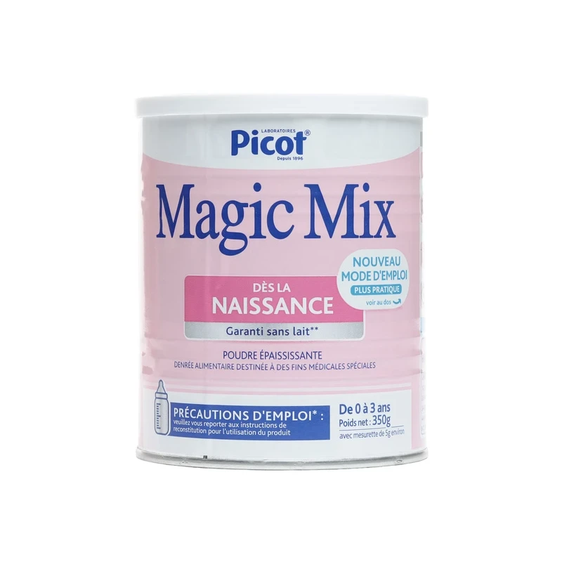 La poudre épaississante Magic Mix de Picot convient parfaitement aux enfants de 0 à 3 ans nécessitant une texture adaptée. Ce produit assure une dissolution complète sans grumeaux pour une alimentation sécurisée et efficace sous contrôle médical.