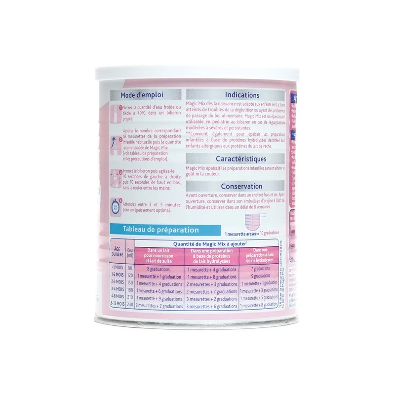 Cette denrée alimentaire destinée à des fins médicales spéciales est recommandée pour la prise en charge diététique des troubles de la déglutition chez le nourrisson et l'enfant. Le Magic Mix dès la naissance convient particulièrement aux bébés souffrant de reflux gastroœsophagien nécessitant un épaississement du lait.