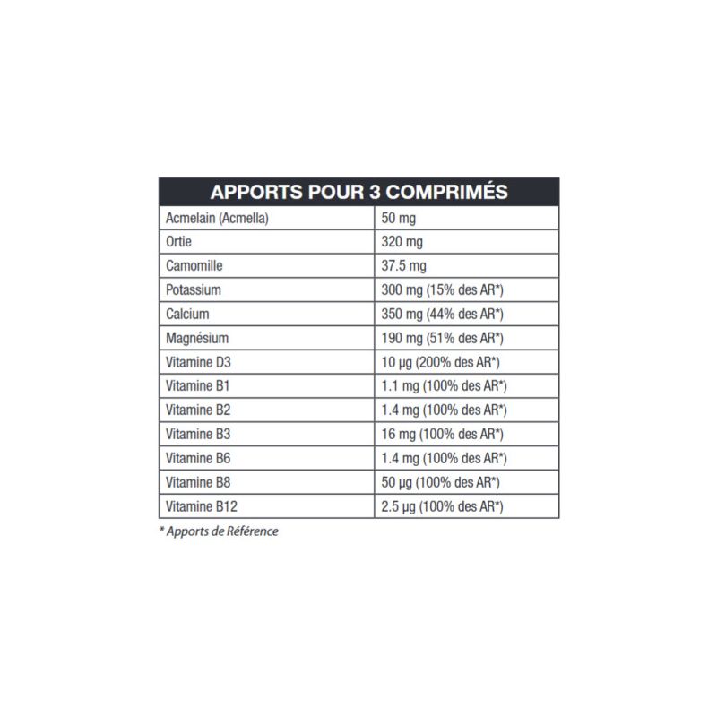Acmelain™ (extrait d'Acmella oleracea), carbonate de magnésium, extrait de camomille matricaire, extrait d'ortie, cellulose microcristalline, amidon de maïs, croscarmellose sodique, agent de charge (alpha-cyclodextrine), oxyde de magnésium, citrate de potassium, chlorure de sodium, anti-agglomérants (sels de magnésium d'acides gras), oxyde de calcium.
