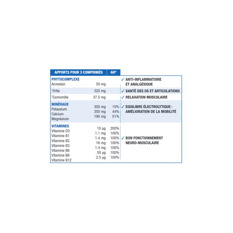 Formule complète : Association de minéraux, vitamines et actifs végétaux pour une solution globale visant à améliorer la qualité de vie quotidienne et l'activité physique.