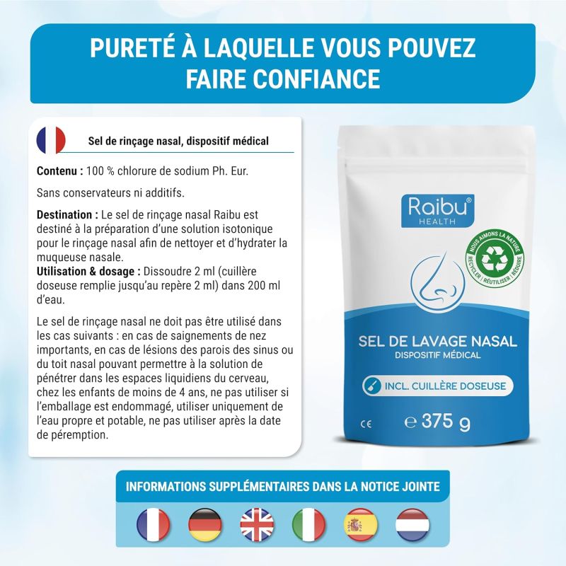 Qualité du sel : Mélange de sels minéraux naturels garantissant une pureté optimale pour l'hygiène du nez.