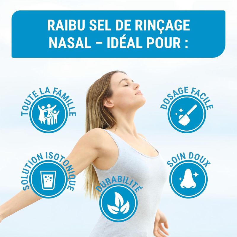 Le sel nasal Raibu offre un excellent rapport qualité prix avec une boîte XXL contenant de nombreux sachets. Les avis clients soulignent sa facilité d'utilisation et son efficacité comparable aux autres marques de sel de rincage disponibles sur le marché.