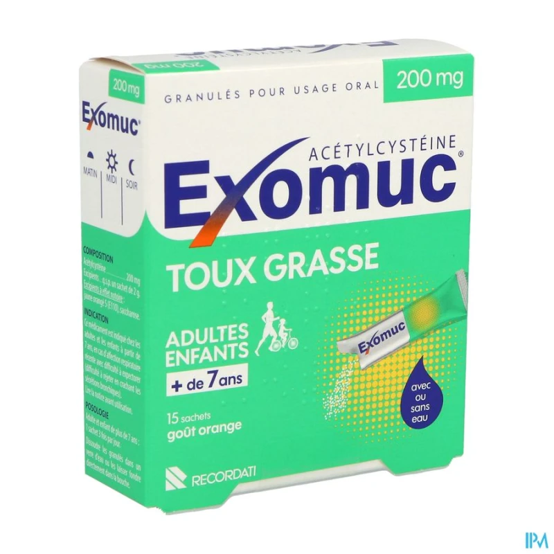Exomuc est utilisé pour fluidifier les sécrétions bronchiques épaisses et faciliter leur expectoration lors d'affections respiratoires avec toux grasse. Son principe actif, la carbocystéine, réduit efficacement l'encombrement bronchique et améliore le confort respiratoire des patients présentant une difficulté à expectorer.