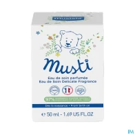 L'eau de soin Musti contient moins de concentration en fragrance qu'une eau de parfum traditionnelle. Elle est spécifiquement formulée pour la peau délicate du bébé avec des ingrédients apaisants et hydratants naturels.