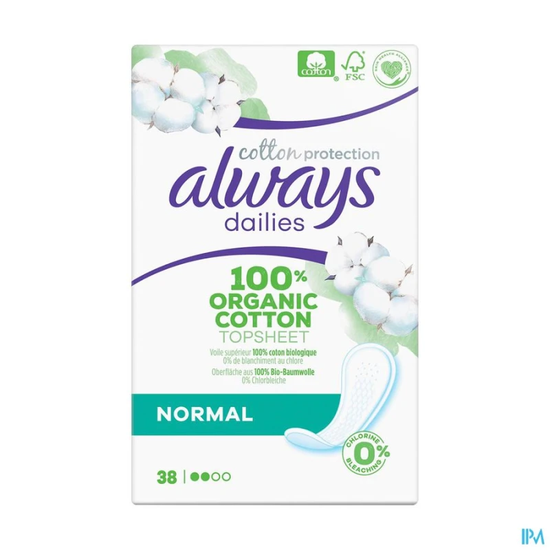 • Les protège-slips ALWAYS Dailies Cotton Protection ont un voile en contact avec la peau composé à 100 % de coton bio.