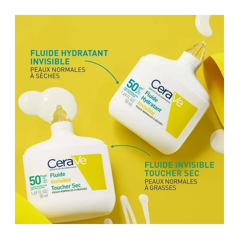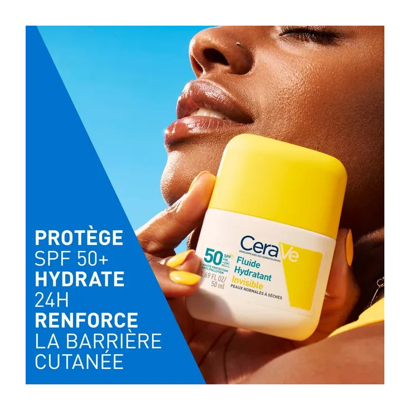 Le CeraVe fluide hydratant invisible offre une texture légère qui pénètre rapidement sans effet gras ni traces blanches. Contrairement aux crèmes solaires classiques, il combine protection UVA UVB et soin hydratant prolongé grâce aux céramides et à l'acide hyaluronique.