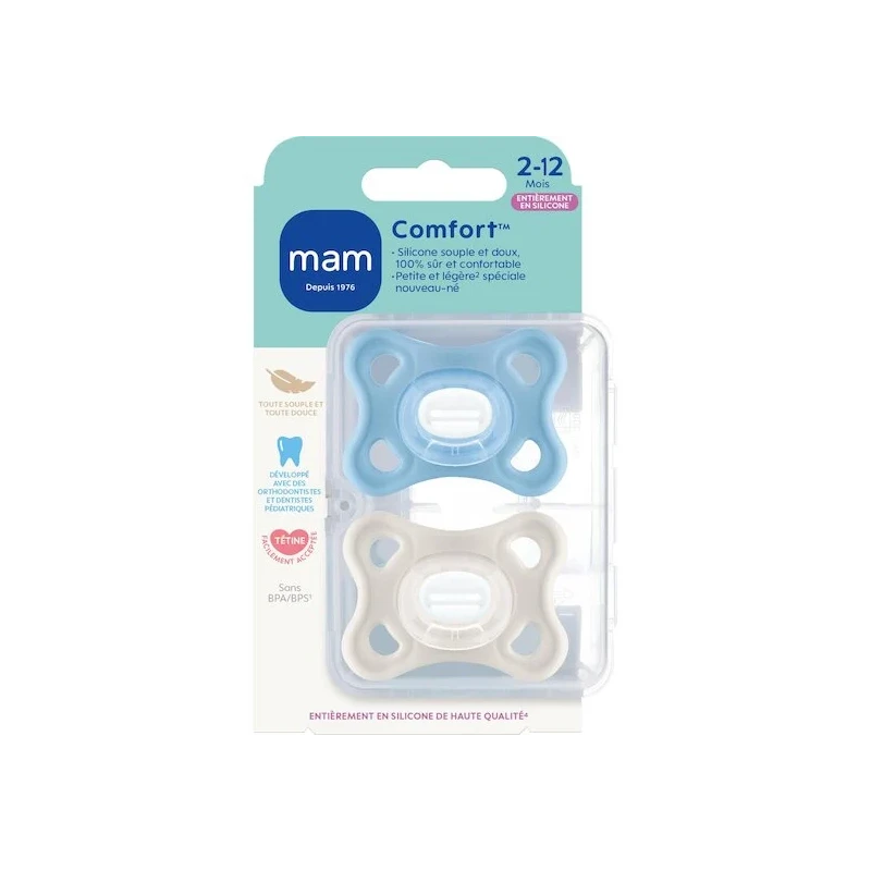 Le lot de 2 sucettes Comfort de MAM est entièrement en silicone, un matériau hygiénique et résistant, sans BPA, qui garantit la sécurité de votre enfant. La tétine symétrique respecte le développement buccodentaire naturel et s'adapte parfaitement à la bouche de bébé.