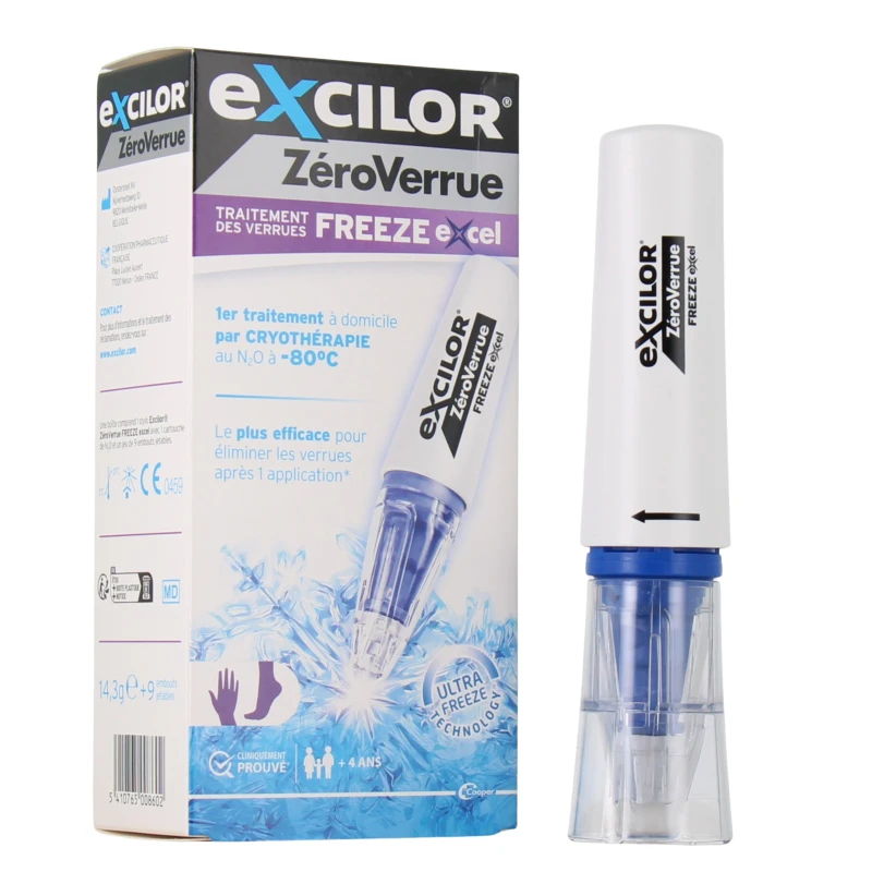 Excilor Zéroverrue Freeze Excel est spécialement conçu pour le traitement des verrues plantaires et communes situées sur les mains et les pieds. Ce produit de cryothérapie convient aux adultes et enfants à partir de quatre ans souffrant de verrues résistantes.